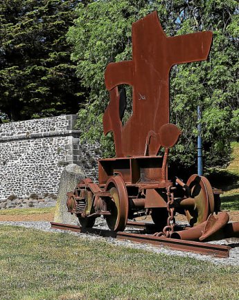 Ce wagonnet surmonté de deux croix ou silhouettes humaines de tôles rouillées interpelle le promeneur.