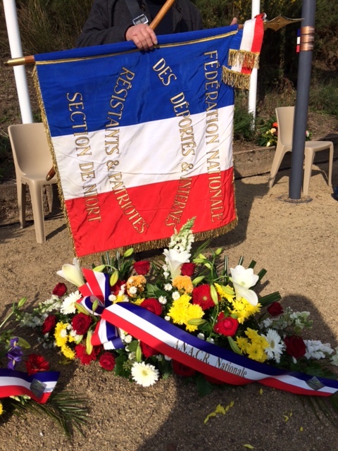Françoise Nonent et son frère Luc GRIJOL, après le dépôt de la gerbe ANACR-Finistère, se recueillent devant le monument à la mémoire des 9 Fusillés de La Sablière, dont leur parent le Docteur Fernand Jacq d'Huelgoat.