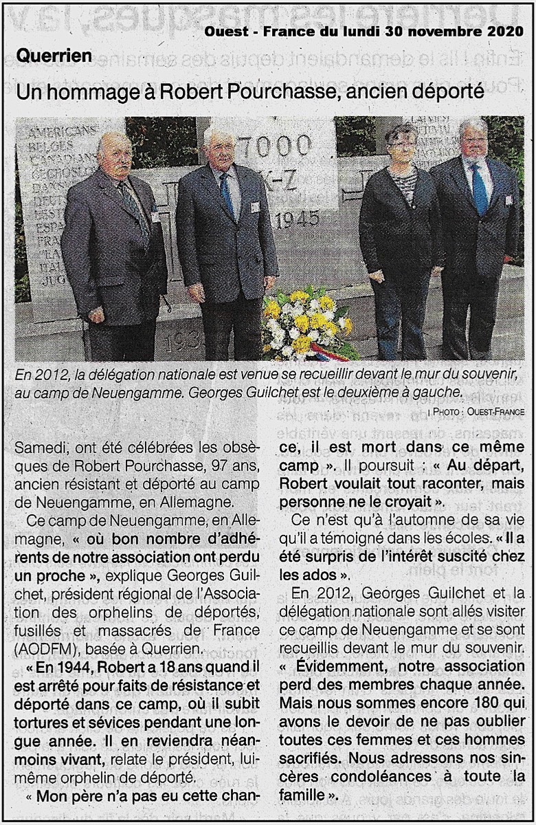 À Larmor-Plage, un dernier hommage au résistant et déporté Robert Pourchasse Les obsèques du résistant et déporté, Robert Pourchasse, emporté par la covid-19 ce lundi 23 novembre à l’âge de 97 ans, ont eu lieu ce samedi 28 novembre, dans l’après-midi.